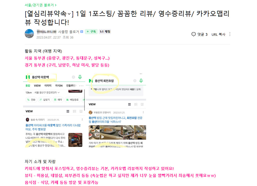 이렇게 사장님들이 올려놓은 체험단 모집 글을 보고