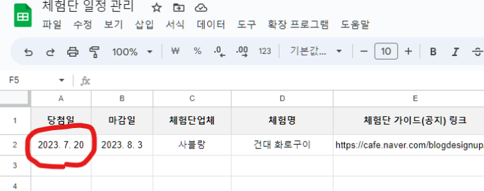 체험단리스트 당첨일,마감일,체험단업체,체험명,체험단 가이드(공지) 링크,메모,예약(방문)일,D-Day 확인 / 포스팅 주소 입력,단가,합계,₩730,000 2023. 7. 20,2023. 7. 26,사블랑,짝이야 제과,https://blog.nav