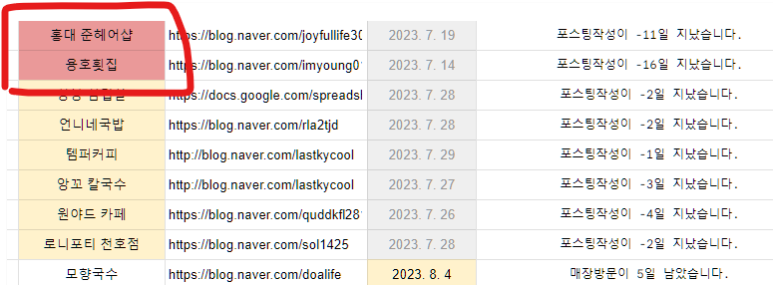 매장 방문일이 지나면 노란색으로, 일주일이 지나면 빨간색으로 표기해 줍니다.