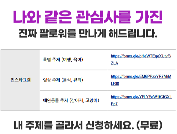 인스타그램 여행, 육아, 음식, 뷰티, 애견 등 주제를 한 가지 선택해서 신청해주세요.