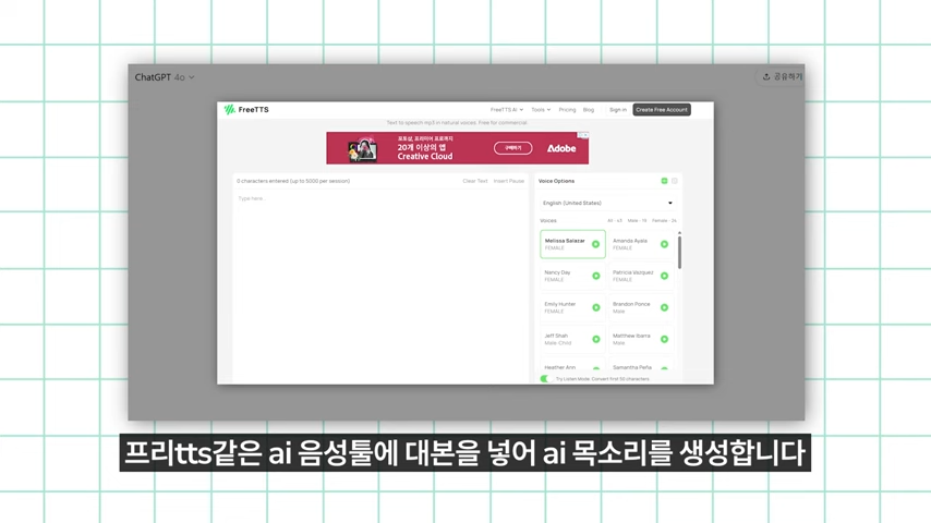 - 생성된 대본을 기반으로 AI 음성 툴(예: 프리 TTS)에 대본을 넣어 목소리를 생성하고, 이후 영상 제작 어플로 관련 이미지를 추가한다.